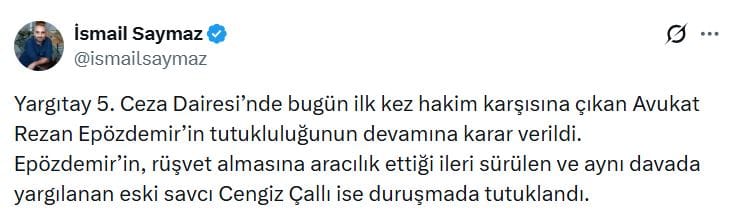 “Yargıtay 5. Ceza Dairesi’nde bugün ilk kez hakim karşısına çıkan Avukat Rezan Epözdemir’in tutukluluğunun devamına karar verildi. Epözdemir’in, rüşvet almasına aracılık ettiği ileri sürülen ve aynı davada yargılanan eski savcı Cengiz Çallı ise duruşmada tutuklandı.”
