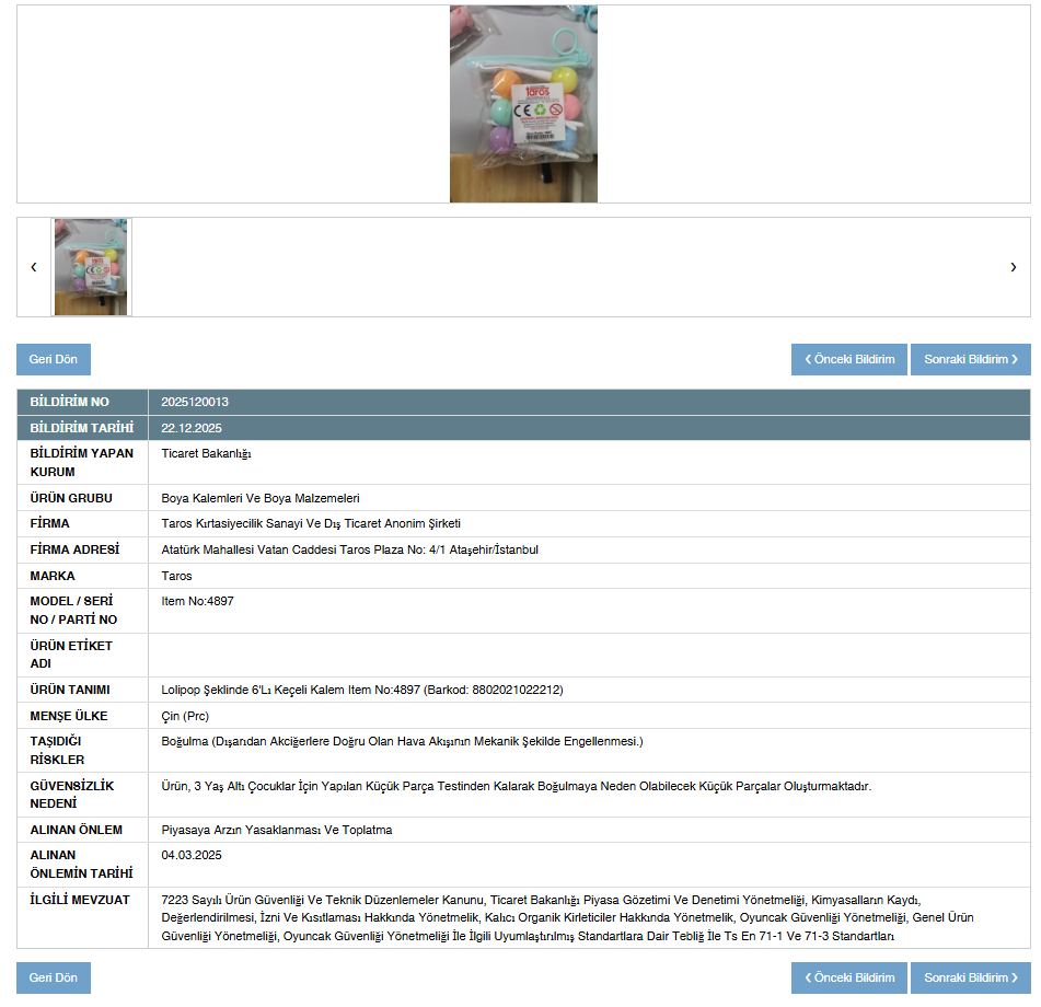 Bakanlığın açıklamasına göre, Taros markasıyla satılan ve lollipop şeklinde tasarlanan keçeli kalem seti, yapılan testlerde küçük parça riski nedeniyle güvenli bulunmadı.