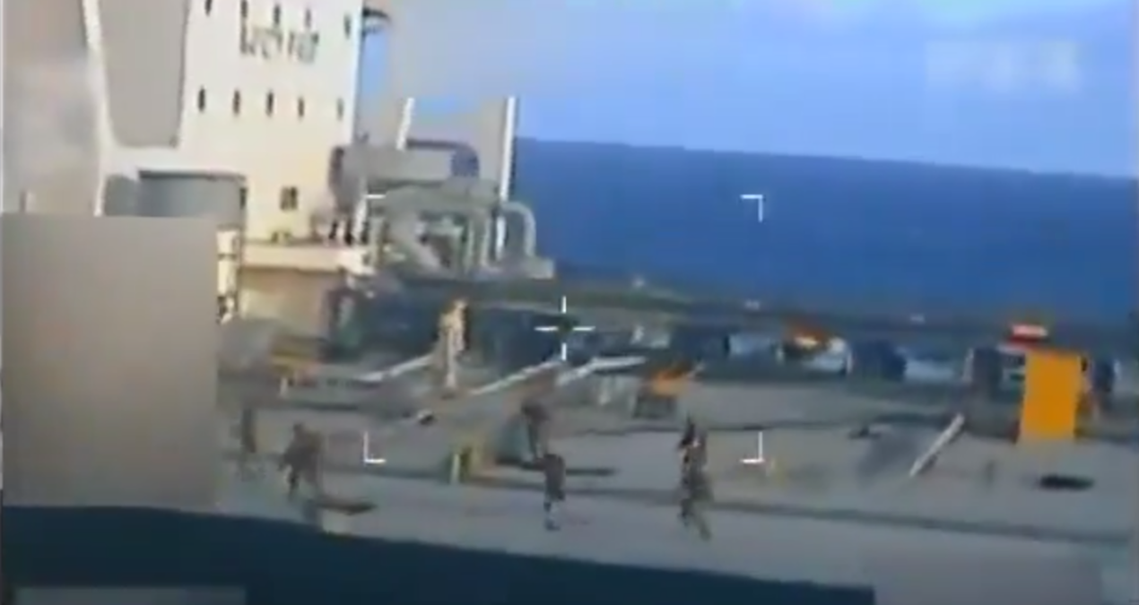 Helikopterlerden çekilen görüntülerde kamuflajlı ve silahlı kişilerin gemiye halatla iniş yaptığı görüldü. Mürettebatın sorguya alındığı duyuruldu.
