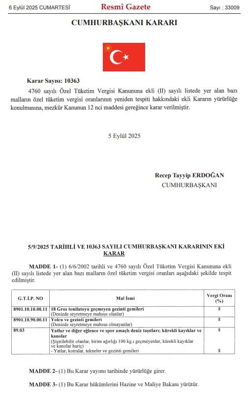 Resmi Gazete’de yer alan Cumhurbaşkanı Kararı’na göre, yat, gemi ve ve teknelere ÖTV getirildi.